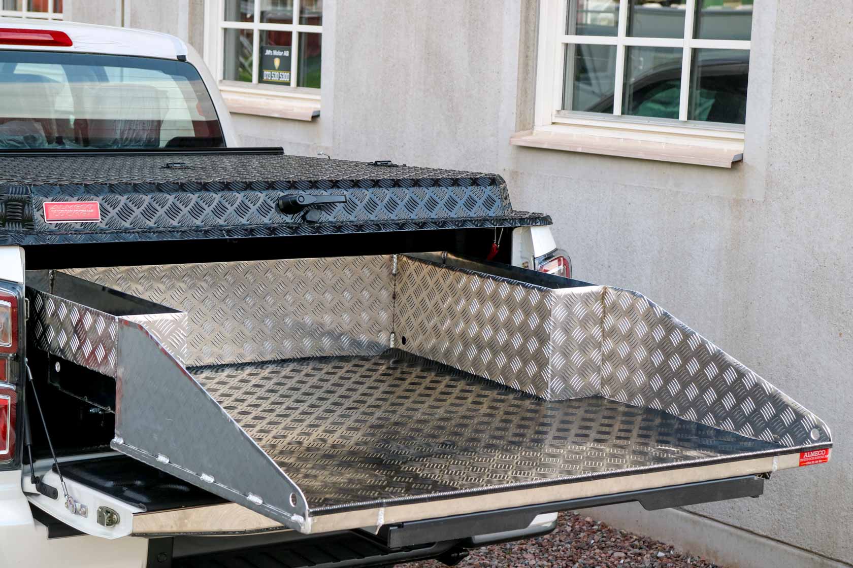 Lastsläde / flaksläde för pickup Toyota Hilux 1½ 2016-. Lastsläden löper på kullager och underlättar åtkomst till din last och dina verktyg. Lastsläden har tre fasta lägen – inskjuten, halvt utdragen och helt utdragen. Släden lösgörs till fritt rullande genom en lägesknapp under bakkanten. Den har sidofack inbyggda i släden och kan levereras med en praktisk gummimatta. Tillverkas av Almeco. Lastsläden kallas också Flaksläde.